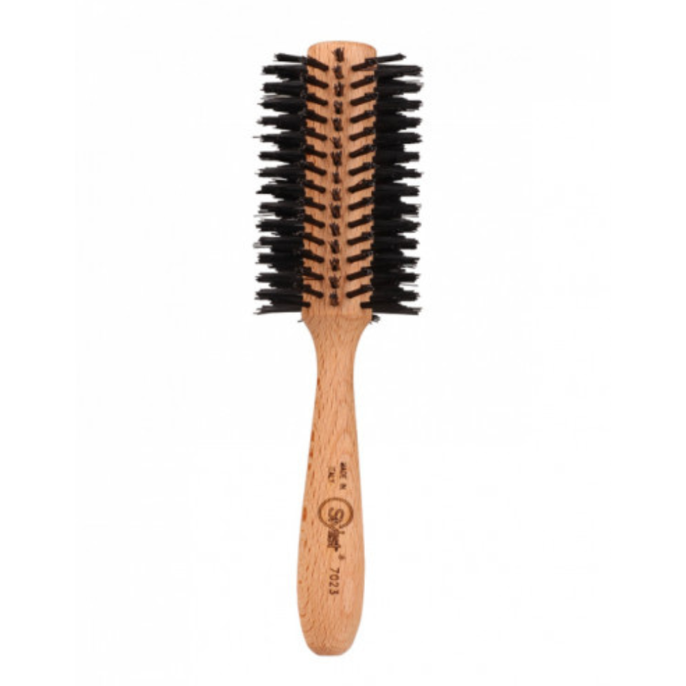 The brush features a wooden handle that allows for ease of use and comes with dense, soft bristles that do not cause harm to the hair strands during styling, but rather stimulate blood circulation in the head by gently massaging it, so it is ideal for all hair types.